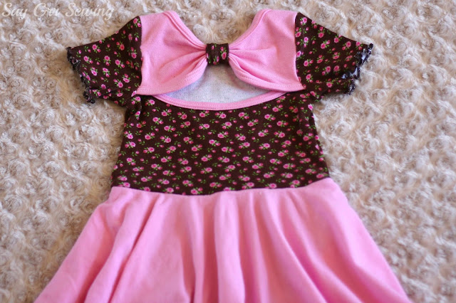 I made the bow-back onesie option with short sleeves and a below-knee-length skirt in size 12 months (and yes, I ironed that tag a little bit too long).